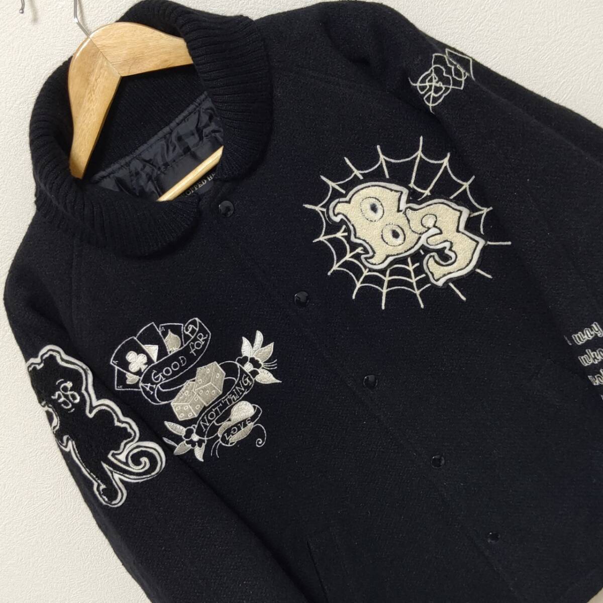 クロップドヘッズのウール100%素材JKTです。人気の高い希少なファラオJKTなので、お探しのかたも多いと思います。フルデコレーションのオシャレデザインで、スタジャンとしても着用いただけます。多少の毛玉はありますが、まだまだお使いいただけるオススメの一品です。ぜひご購入下さい。